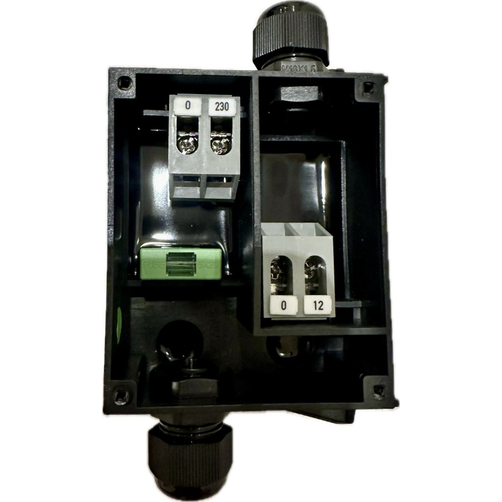After opening, the wiring terminals are easily accessible. The housing is made of high-quality grey plastic. Made in the Czech Republic.