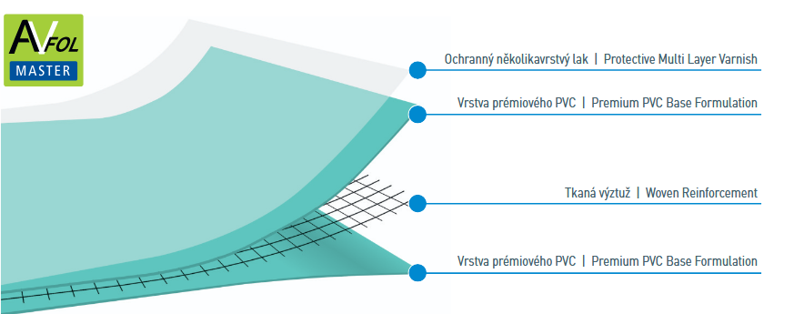 Bazénová fólie AVfol Master využívá vícevrstvou konstrukci, která zajišťuje vysokou pevnost, dlouhou životnost a spolehlivou ochranu bazénové vany. Jednotlivé vrstvy na sebe přesně navazují a společně vytvářejí odolný celek vhodný i pro náročné provozní podmínky.
