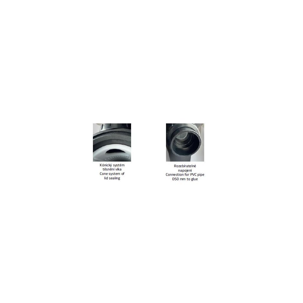 Připojeni vnitřním závitem 1 1/2" nebo vlepením 50mm trubky do šroubení, které je v balení.