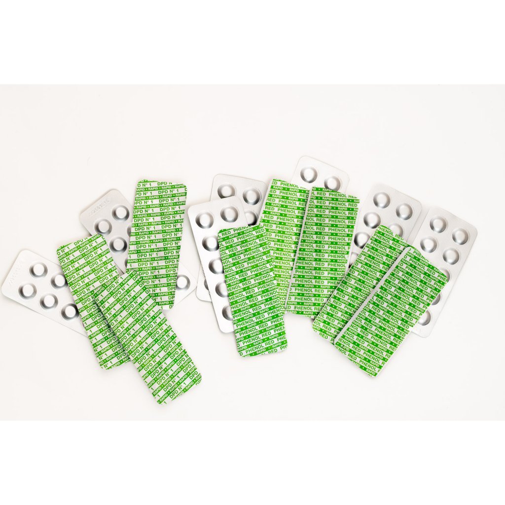 | DPD1 testovací tablety – 5 platíček | Tablety pro měření volného chloru v bazénové vodě. Reagují s chlorem a zabarví vzorek vody, který se následně porovnává s barevnou stupnicí testeru. |