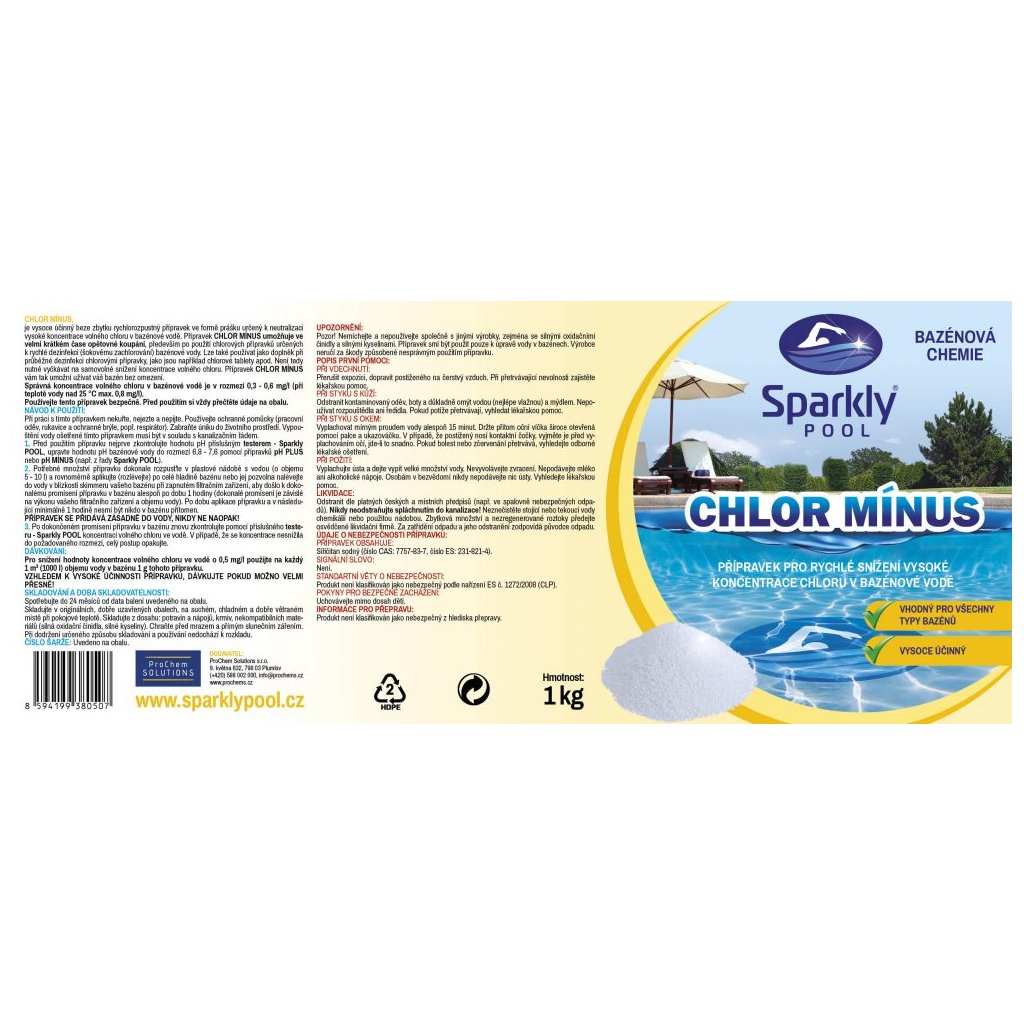 Sparkly POOL Chlor mínus – chlor stop 1 kg rychle snižuje nadbytečný volný chlor v bazénové vodě. Je vhodný pro všechny typy bazénů a šetrný k technologiím i povrchům. Snadno se dávkuje, rychle účinkuje a pomáhá udržet vodu bezpečnou a příjemnou pro koupání.