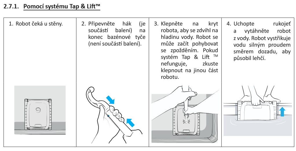 Praktická funkce Tap&Lift umožňuje robota jednoduše přivolat ke stěně bazénu a snadno jej vyjmout bez námahy.